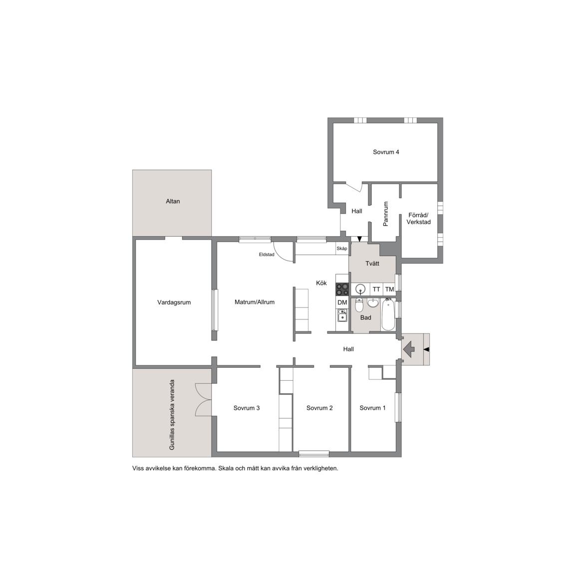 Orsak: Grundläggning uppges vara betongplatta samt mindre krypgrund; utan besiktning är fukt/mögelrisk okänd.
